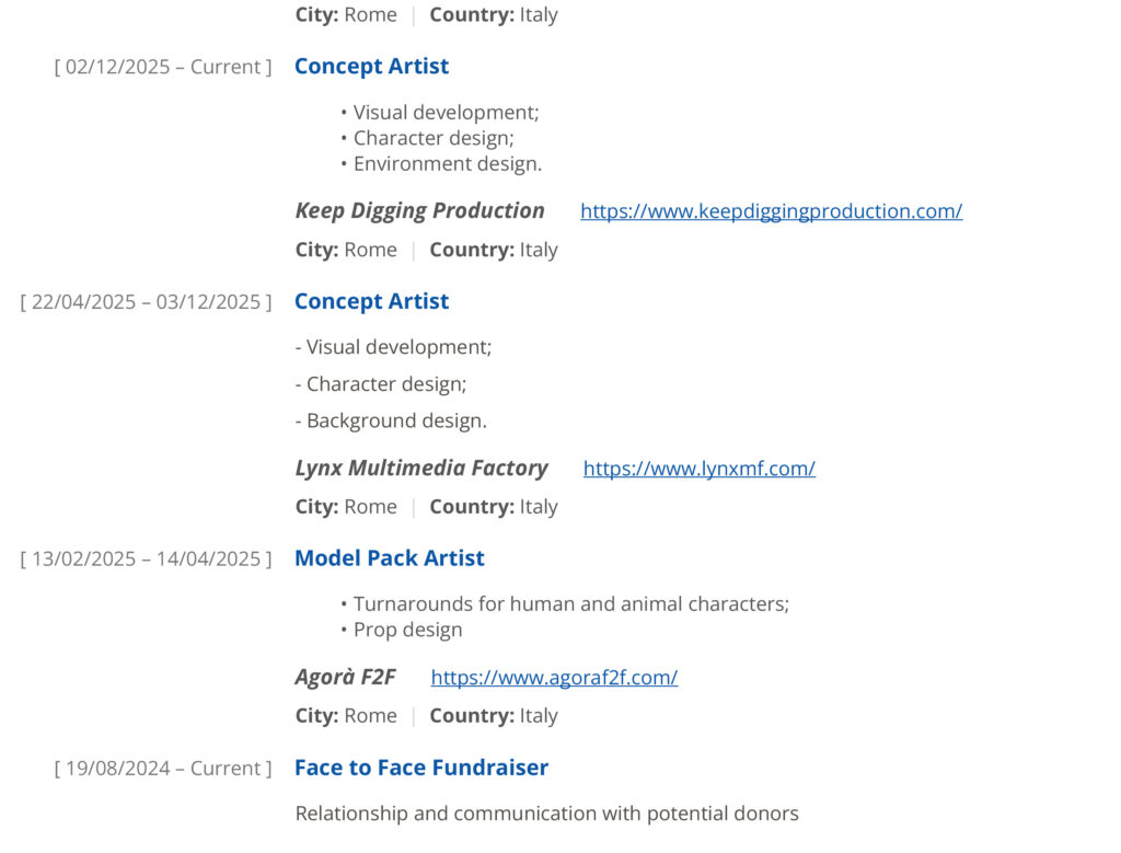 I received my bachelor’s degree in Media Arts from the Academy of Fine Arts of Rome (ABAR) in 2021. In February 2024, I received my master’s degree in Computer animation and visual effects from Rome University of Fine Arts (RUFA). Between September 2023 and July 2024, I did a master’s degree course in Concept Art at Rainbow Academy. Finally, since November 2023, I have been doing private storyboard mentoring sessions with Story Artist and Art Director Alessandra Sorrentino.